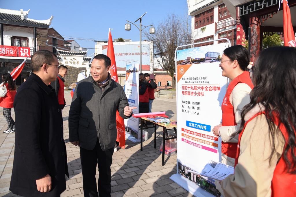 12月5日,由团委、学生处和二级学院60余名志愿者组成的社会实践服务团,赴万州区恒合乡开展助力乡村振兴社会实践活动。服务团分别开展了党的十九届六中全会精神宣传、创文明城市宣传、心理健康知识宣传、艺术小课堂、义务电器电脑维修等社会实践活动。党委常委、副校长臧小林,恒合乡党委委员、副乡长张强为社会实践服务团授旗,指导活动开展。