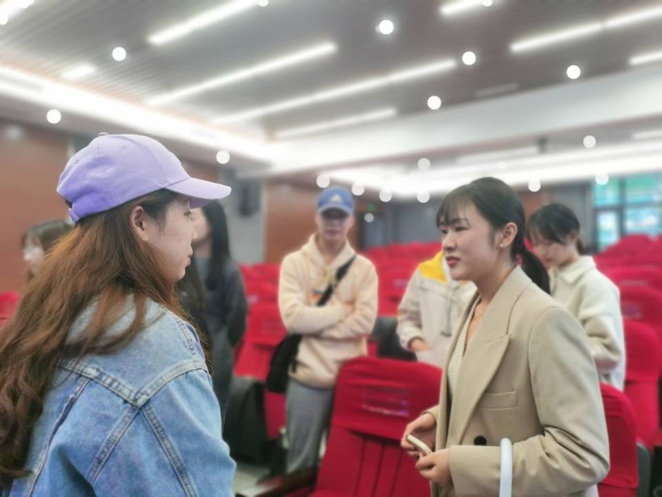 万州区高峰街道社保所、beat365官网2019届毕业生佘佳林(右一)在与应届毕业生交流
