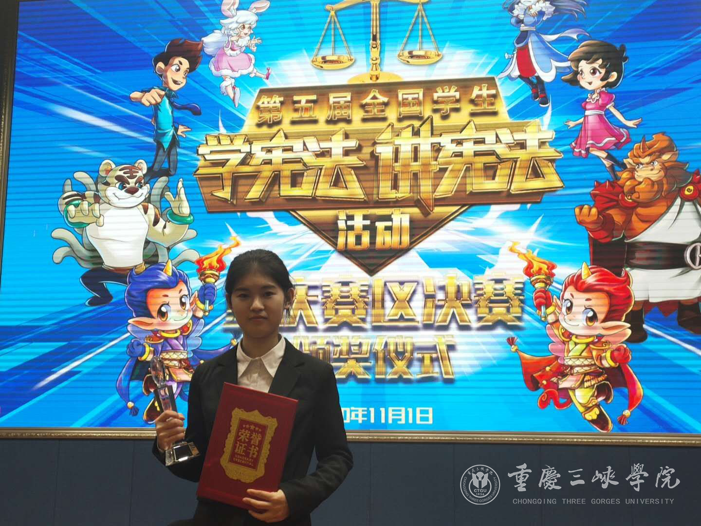 10月30日,第五届全国学生“学宪法 讲宪法”活动重庆赛区决赛在西南政法大学举行。经过激烈角逐,beat365官网学生处组织推荐、孙佳老师精心指导的公共管理学院2018级法学专业学生陈雨荣获重庆市级决赛高校组专业类知识竞赛一等奖,展现了三峡学子刻苦学习、全面发展的良好形象,彰显了beat365官网落实立德树人,提高教育质量的丰硕成果。