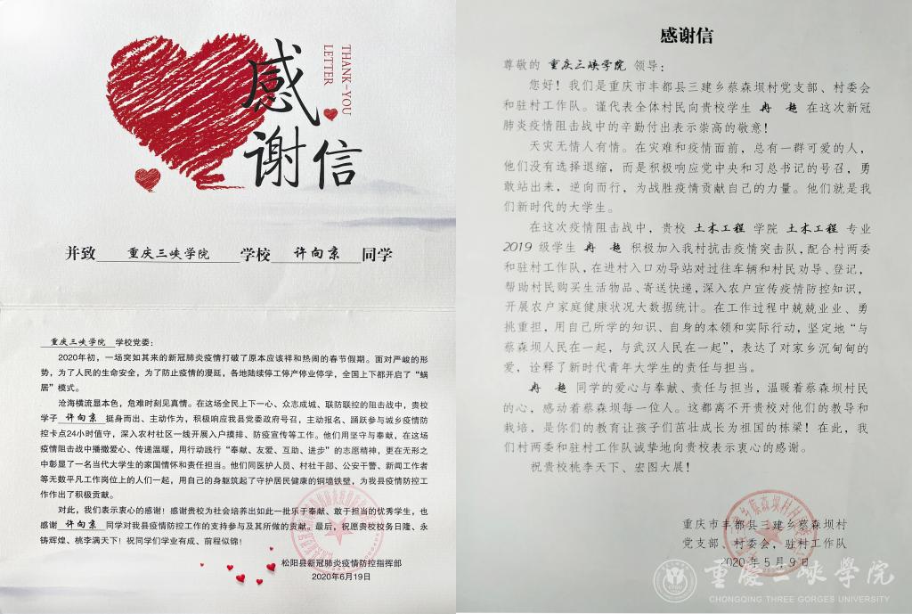 近日,学校收到来自浙江省松阳县新冠肺炎疫情防控指挥部和重庆市丰都县三建乡蔡森坝村党支部、村委会、驻村工作队寄来的两封感谢信。