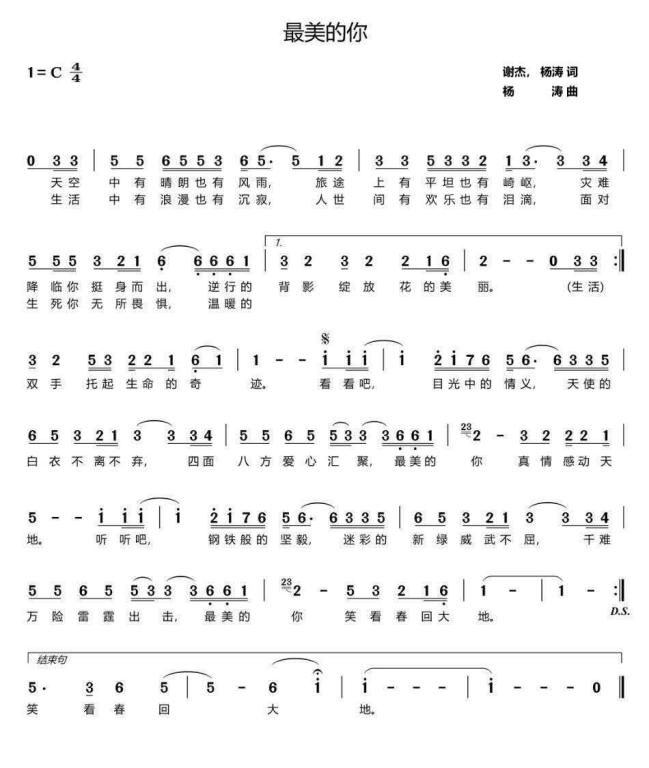 《最美的你》的歌词里,用“晴朗”与“风雨”,“平坦”与“崎岖”表达了病疫的突入其来,用“浪漫”与“沉寂”,“欢乐”与“泪滴”描述了医务及抗疫工作者们舍家离子奔赴抗疫前线的难舍心情,用“挺身而出”“无所畏惧”描述了他们义无反顾的英雄之举。通过优美、激昂的旋律与清新、明朗的童音,把对“最美的人”的崇敬、赞美、歌颂之情完美诠释出来。