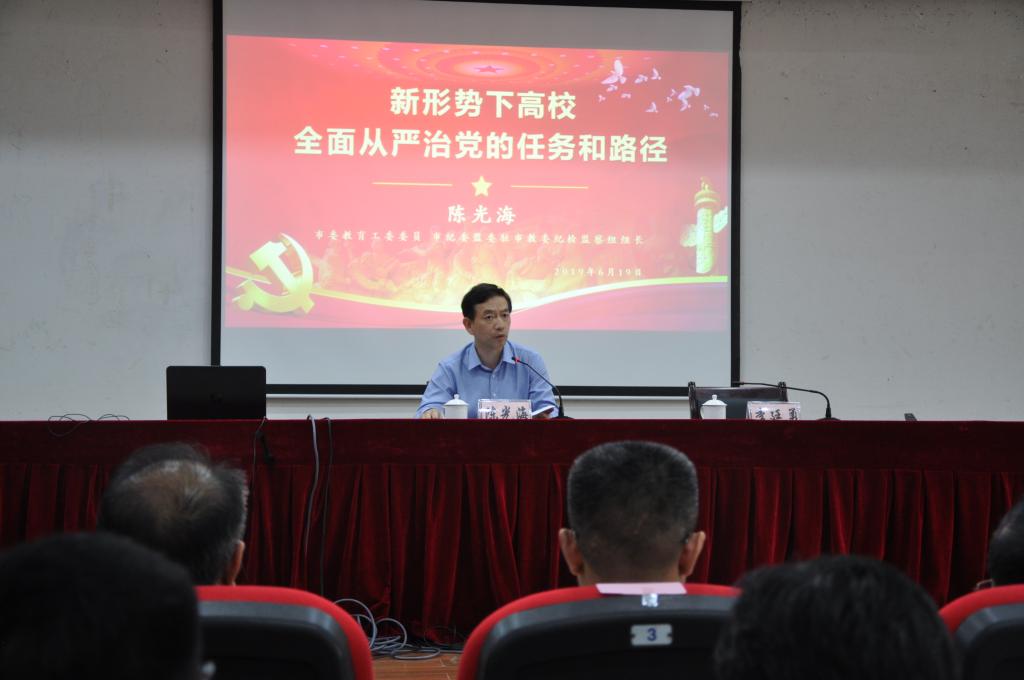 陈光海从准确把握全面从严治党的新要求、切实认清从严监督执纪新形势、努力解决高校全面从严治党新问题三个方面对当前高校全面从严治党和纪检监察工作进行了精彩的阐述。