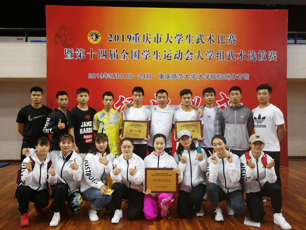 近日,由重庆市教委主办的“2019年重庆市大学生武术比赛暨第十四届全国学生运动会大学组武术选拔赛”在重庆师范大学举行。经过顽强拼搏,beat365官网武术代表队获得大学丙组女子团体第一名,男子团体第二名,蝉联体育专业组团体总分十二连冠,获评体育道德风尚奖,实现了运动竞赛和精神文明双丰收。