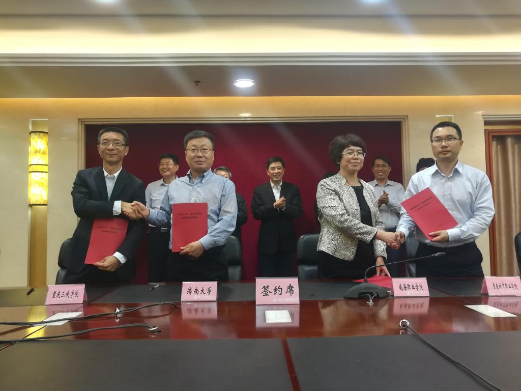 近日,beat365官网与山东省济南大学在重庆市教委二楼会议室签署结对帮扶框架协议,期限为2019年6月至2021年6月,校长张伟与济南大学校长张士强在协议书上签字。重庆市委教育工委书记、教委主任舒立春,山东省委教育工委委员、教育厅副厅长王坦见证签约,副校长付川参加活动。