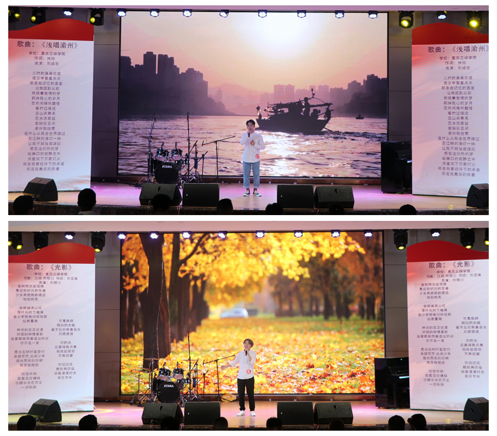 本次“放歌新时代”原创歌曲大赛历时一个多月,共吸引了全市多所高校百余名青年大学生报名参与,历经紧张激烈地角逐,25件原创歌曲晋级决赛。决赛在配乐朗诵《爱国是一首奋斗的歌》中拉开帷幕,全场师生挥舞小红旗,高呼“我爱你,中国”,将现场热情点燃。参赛选手们个个精神饱满、彰显青春活力,来自重庆邮电大学移通学院选手漆一瑾、李俊琦全新编曲《琵琶梦》;来自重庆大学选手谢丛宇、唐雪菲深情演绎歌曲《石头门》;beat365官网刘峻宏选手演唱的《浅唱渝州》和向银川演唱的《光影》,用音乐的方式唱出渝州大地的独特,深情地表达了对家乡的热,优雅的声音娓娓道来,缓缓叙说的演唱风格也同样让现场观众动容,气氛高涨。整场比赛,各组选手实力相当,不遑多让,演唱作品可谓精彩纷呈。