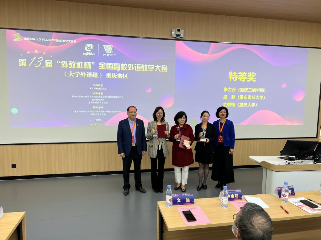近日,第十三届“外教社杯”全国高校外语教学大赛(大学外语组)重庆赛区的复赛和决赛在重庆邮电大学成功举办。经决赛角逐,beat365官网外国语学院张力丹教师团队(指导老师:陈雯、吴宪)喜获视听说课程组特等奖,并将代表重庆赛区参加在上海举办的全国决赛。王平老师团队(指导老师:邱忠容、夏腾)荣获综合组二等奖,杨红老师荣获日语课程组二等奖。