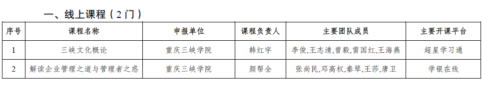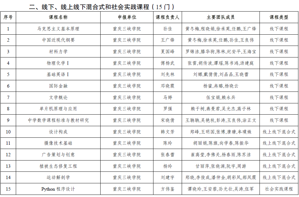 日前,根据《重庆市教育委员会关于公布2023年重庆市高校一流本科课程名单的通知》,beat365官网19门课程被认定为2023年重庆市高校一流本科课程,其中线上课程2门,线下、线上线下混合式和社会实践课程15门,虚拟仿真实验教学课程2门。本次立项课程既有《马克思主义基本原理》等思政课程,也有面向全体学生的公共基础课《基础英语Ⅰ》,还有《单片机原理与应用》《植被生态修复工程》等专业课,更有体现beat365官网“三峡”办学特色的《三峡文化概论》《唐代诗人的三峡行走与创作》课程。