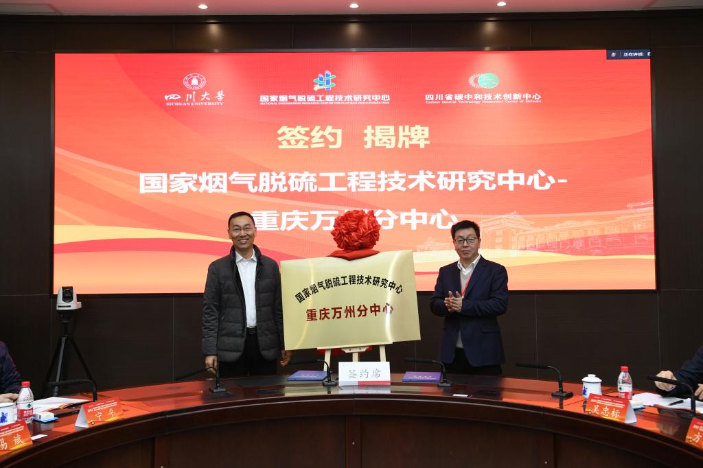 王建平与刘超为“国家烟气脱硫工程技术研究中心重庆万州分中心”揭牌,祁俊生与李建军签署合作协议,汪华林院士为分中心负责人颁发聘书。双方对分中心未来在技术研究、人才培养、资源共享等方面的建设规划进行了积极探讨。