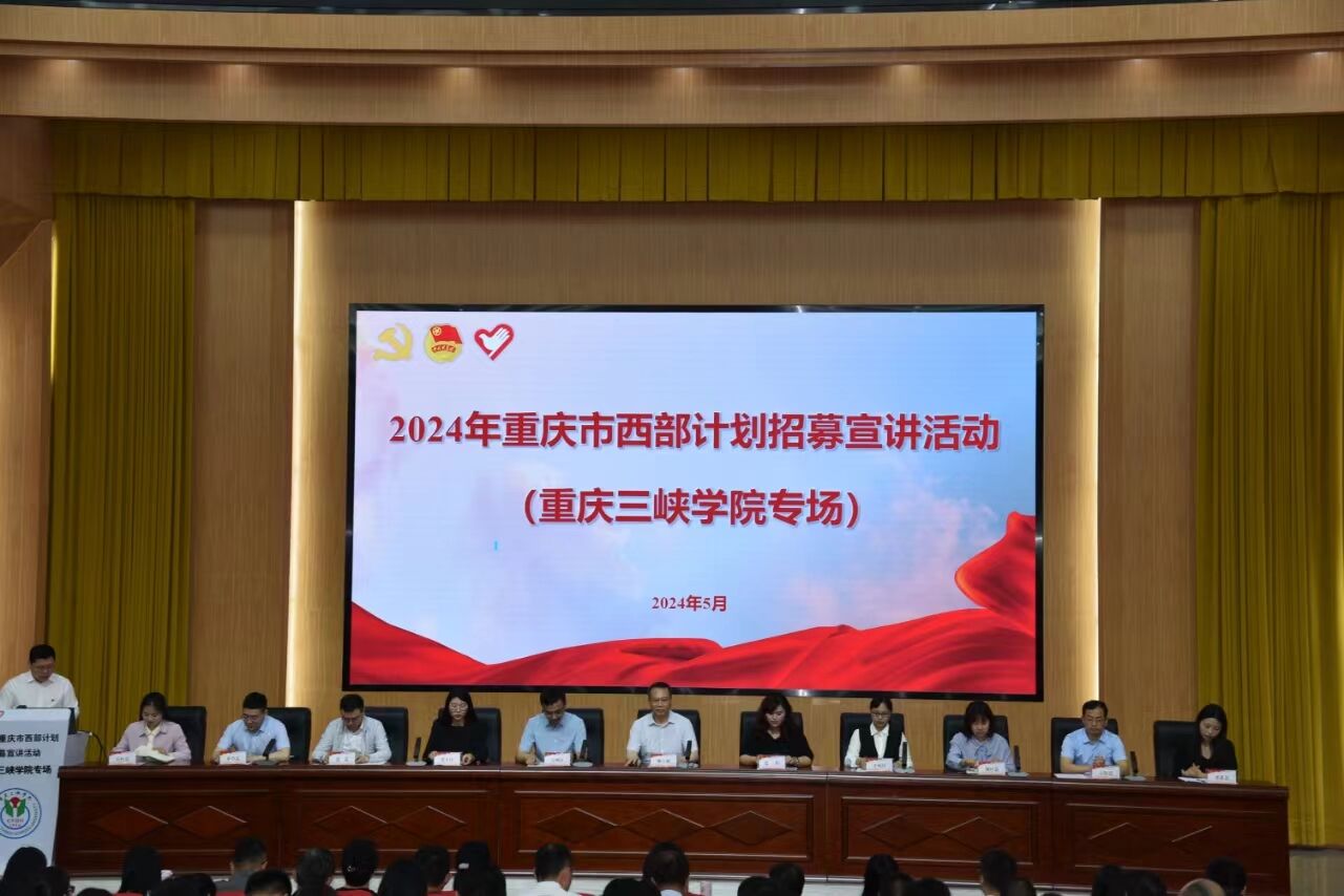 5月9日,2024年重庆市大学生志愿服务西部计划招募宣讲活动(beat365官方网站专场)在博学楼报告厅举行。重庆市志愿服务工作指导中心干部,万州区、开州区、梁平区、云阳县、城口县、忠县、奉节县、巫溪县、石柱自治县9个服务区县团委主要负责人等来校宣讲西部计划招募的有关政策。学校党委常委、副校长臧小林,招生就业处、团委等部门负责人,各二级学院党总支负责人、毕业年级辅导员以及240余名毕业生参加了招募宣讲活动。