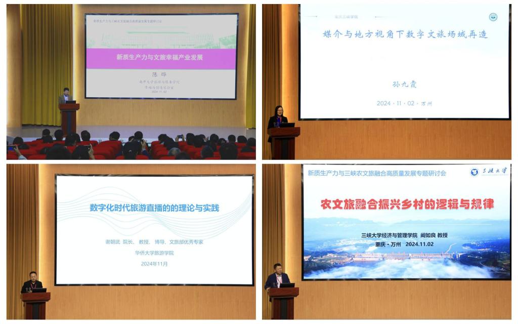 陈晔、孙九霞、谢朝武、阚如良分别以《新质生产力与文旅幸福产业发展》《媒介与地方视角下的数字文旅场域再造》《数字时代旅游直播营销的理论与实践》《农文旅融合振兴乡村的逻辑与规律》为主题作报告,深刻剖析了当前文旅产业面临的新机遇与挑战,并从理论与实践的双重维度,为三峡农文旅融合的创新发展提供了宝贵的参考。