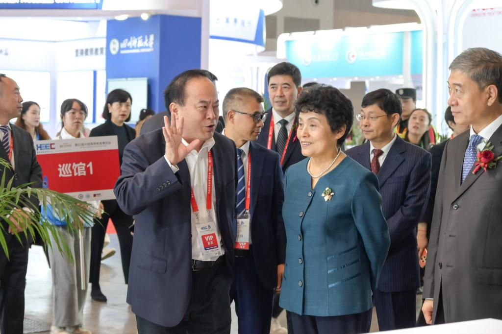 巡展开始不久,中国高等教育学会副会长、教育部原党组成员、副部长林蕙青;教育部高教司副司长武世兴;重庆市政府副市长马震、副秘书长凌凡;重庆市委教育工委书记、市教委主任刘宴兵,副主任蒋云芳;重庆大学党委书记舒立春;重庆市高等教育学会会长严欣平等就来到学校展厅。李廷勇、李敬、郭作飞、代远红、王良伟等学校领导立即上前欢迎他们光临指导。李廷勇对学校参加本次高博会的成果展示工作及近年学校推进高质量发展情况作了简要介绍,马震握着李廷勇的手说:“不错,不错!”舒立春对李廷勇高兴地说:“你们干也干得好,你今天讲也讲得好!”