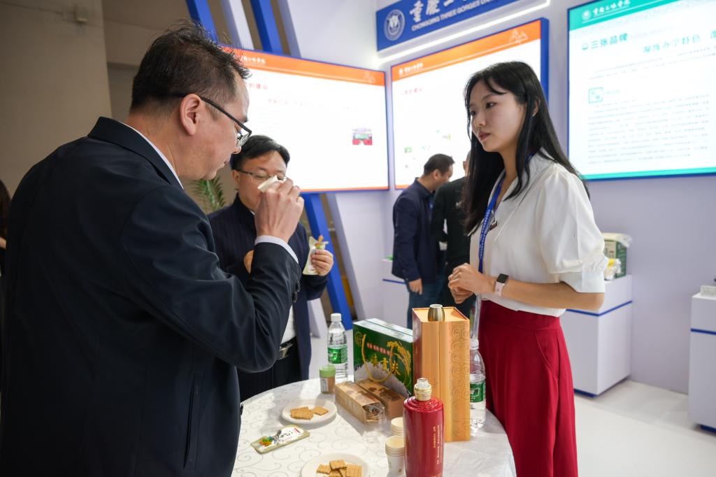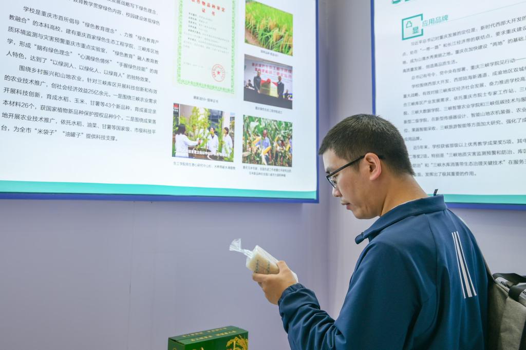 人来人往,川流不息的展厅里,重庆开放大学阳世雄、吴昌平等6人进来了,有的饶有兴致地翻看“夔州诗研究”“三峡文化研究”“何其芳研究”图书资料,有的仔细端详农科院研制的种子、面条、酒类、大米等。阳世雄向一行的同事说:“beat365官方网站产教研融合做得很好,教师们的创新精神和创新能力也很强,值得我们认真学习。”