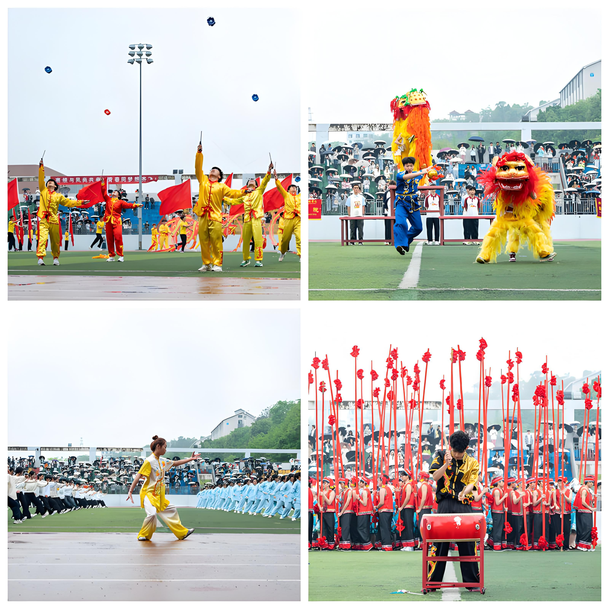 开幕式后的文体展演极具三峡文化特色,精彩纷呈的节目让人目不暇接。《中国龙》表演气势磅礴,似蛟龙破云,展现出中华民族的雄浑气魄;《舞狮》灵动活泼,象征着三峡地区的豪迈与热情;《黎族竹竿舞》充满民族风情,编织起中华各民族团结一心的美好画卷;《霍元甲》表演刚劲有力,彰显出三峡青年的壮志豪情;《重庆,要的》节奏欢快,将雾都重庆的独特魅力展现得淋漓尽致;《爱在万州》描绘出高峡平湖的秀丽风光,令人陶醉;《花式篮球》表演技巧娴熟,勾勒出民族和谐的同心圆;《太极拳比赛》舒缓沉稳,弘扬了中华传统文化,传递着健康生活的理念。最后,全场师生共同合唱《我和我的祖国》,用歌声抒发对祖国的热爱和教育强国的坚定信念。