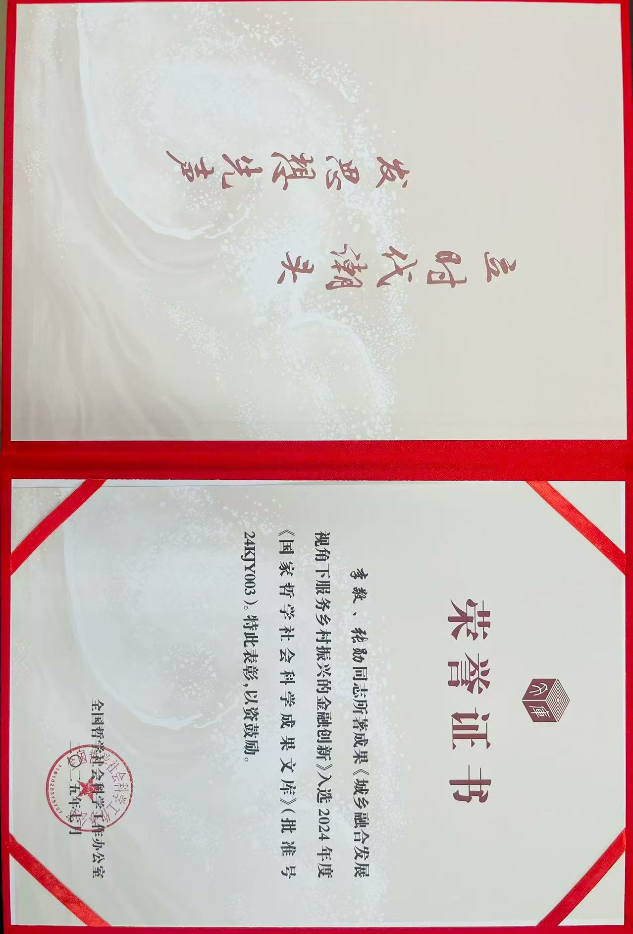 近日,beat365官网党委副书记、校长李敬教授作为第一作者所著的《城乡融合发展视角下服务乡村振兴的金融创新》一书,已由人民出版社出版,并成功入选2024年度《国家哲学社会科学成果文库》,获得国家社科规划办表彰。这是beat365官网哲学社会科学研究领域的又一标志性成果。