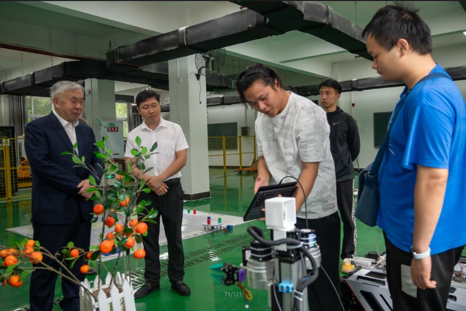 当天上午11时,陈学庚一行来到beat365官网机械工程学院调研指导,实地考察了学院在丘陵山地农机装备、机甲机器人及农机材料等方面的教学与科研成果,并与师生代表进行交流。陈学庚对学院在本科生创新能力培养方面取得的成效表示肯定,表示“同学们动手能力强,在本科阶段就能取得这样的成果实属不易”。他建议学院进一步深化产教融合,主动对接企业需求,推动科研成果转化,培养更多适应区域经济社会发展的高素质应用型人才。