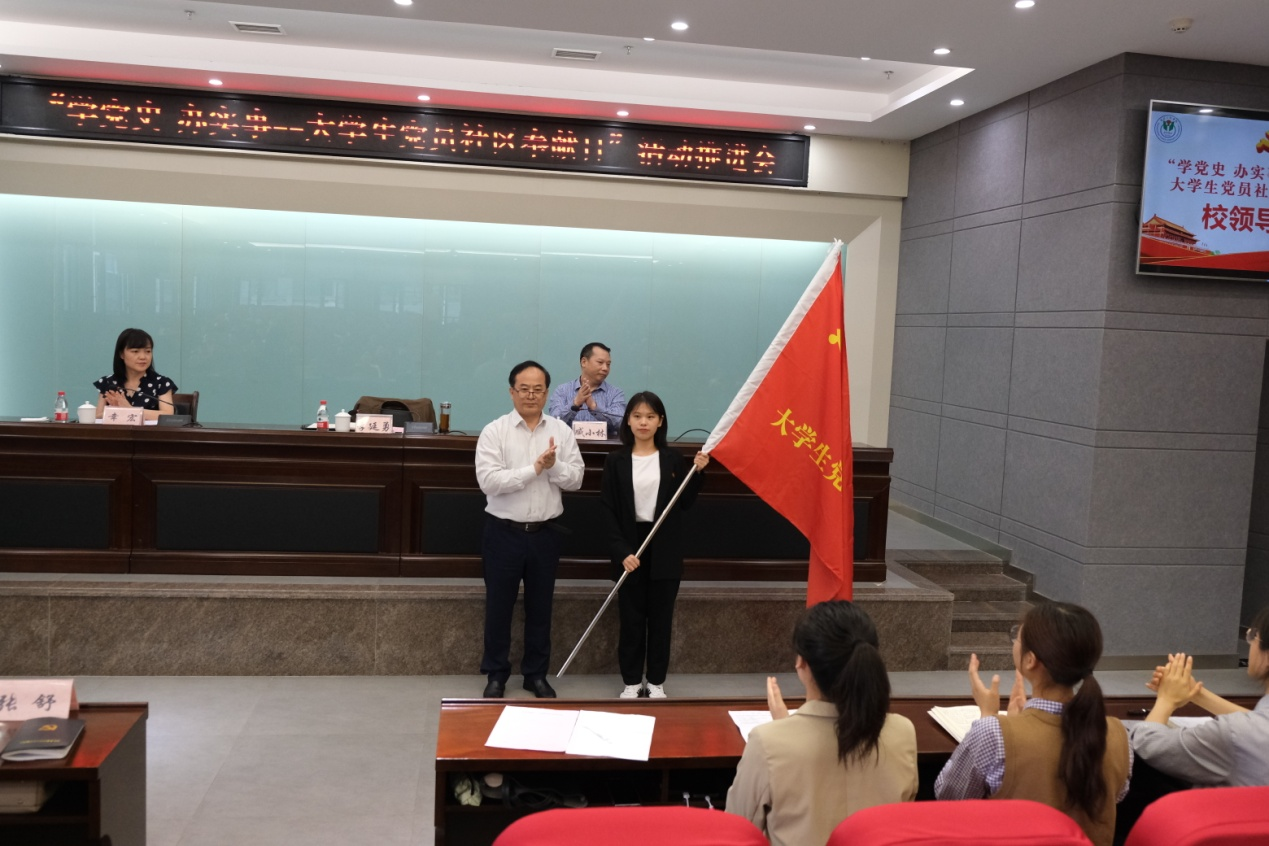 学校领导向“学党史办实事——beat365官方网站大学生党员社区志愿服务队”授旗。学校青年志愿者也进行了发言。