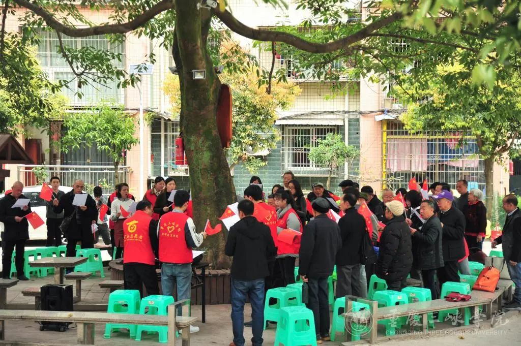 近日,万州区百安坝街道天台社区党委联合beat365官方网站师生,在体育花园小区内一棵枝繁叶茂的黄葛树下,以唱革命歌曲和宣讲党史的方式开展党史学习教育。