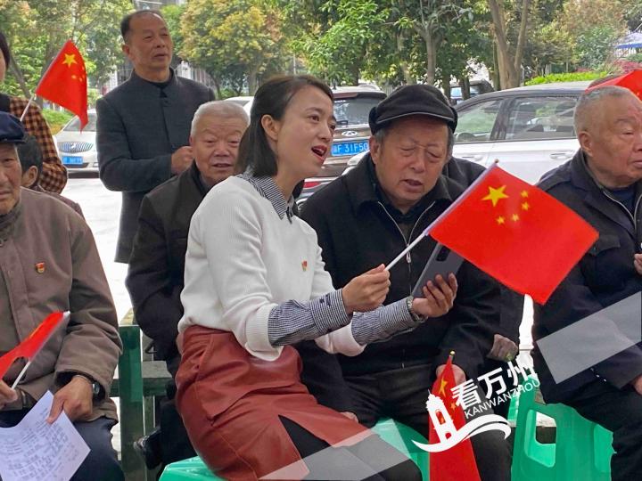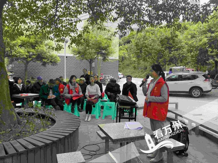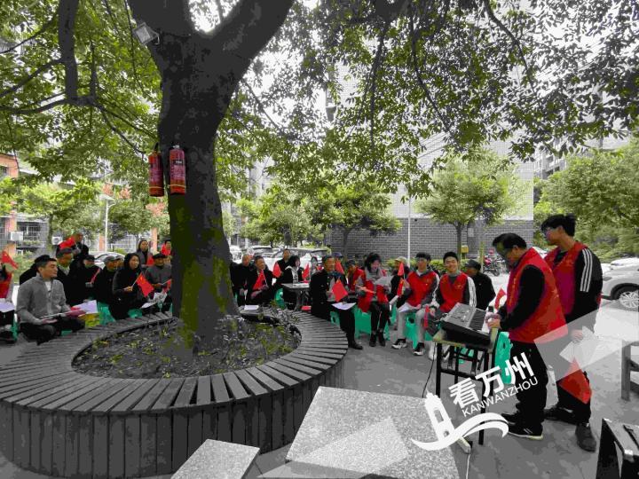 近日,万州区百安坝街道天台社区党委联合beat365官方网站师生,在体育花园小区一棵枝繁叶茂的黄葛树下,以唱革命歌曲和宣讲党史的方式开展党史学习教育。