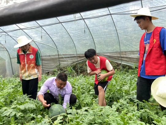回到学校的师生还一直牵挂着村民的灾后生活,他们了解到,除了被洪水冲毁的,因为交通受损,剩余的西瓜、香菇、羊肚菌等农产品严重滞销,尤其是西瓜可能全部要烂在泥地里面了。他们希望能够尽快回到村里,完成原计划的“三下乡”任务,力所能及的帮助这些受灾的村民。7月10日,洪水退去后刚刚恢复通车,“薪火乡传”团队的指导老师张丽就带着6名大学生,赶回村里帮助瓜农摘瓜、运瓜、装车,还通过“直播带货”公益售卖,帮助农民降低损失,目前已经销售西瓜约3000斤,香菇、羊肚菌30余盒,帮助农户增收近2万元。