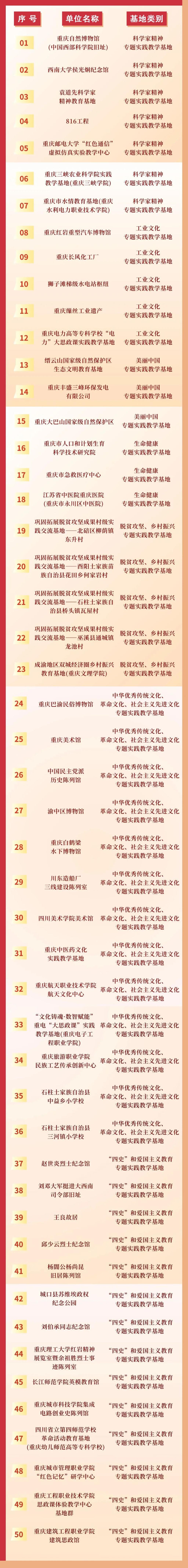 为深入贯彻落实习近平总书记关于“大思政课”建设的重要指示批示精神,切实推进“大思政课”建设走深走实,加快构建“大思政课”工作格局,近日,市教委会同市委宣传部、市科技局、市经济信息委、市生态环境局、市卫生健康委、市乡村振兴局、市文物局、市科协、市关工委等10部门发布《关于公布重庆市首批“大思政课”实践教学基地名单的通知》。下面,随小育来看具体名单——