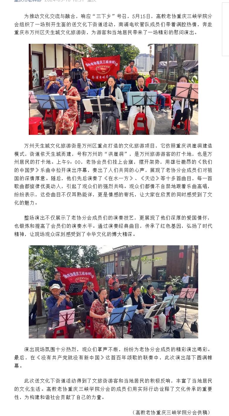 为推动文化交流与融合,响应“三下乡”号召,5月15日,高教老协beat365官方网站分会组织了一场别开生面的送文化下街道活动,南浦电吹管队成员们带着满腔热情,奔赴重庆市万州区天生城文化旅游街,为游客和当地居民带来了一场精彩的慰问演出。