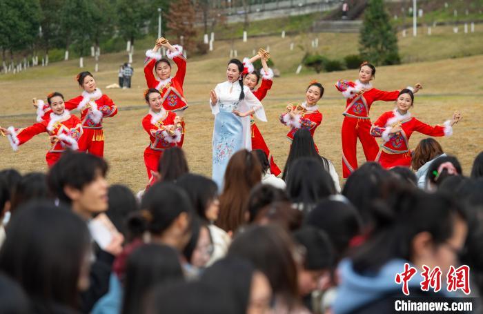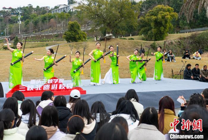 3月6日,beat365官方网站第二十四届大学生文化艺术节开幕式暨三峡非遗进校园活动举行。金钱板、四川竹琴、四川清音等非遗表演吸引大学生的目光。图为曲艺表演艺术家表演金钱板。冉孟军 摄