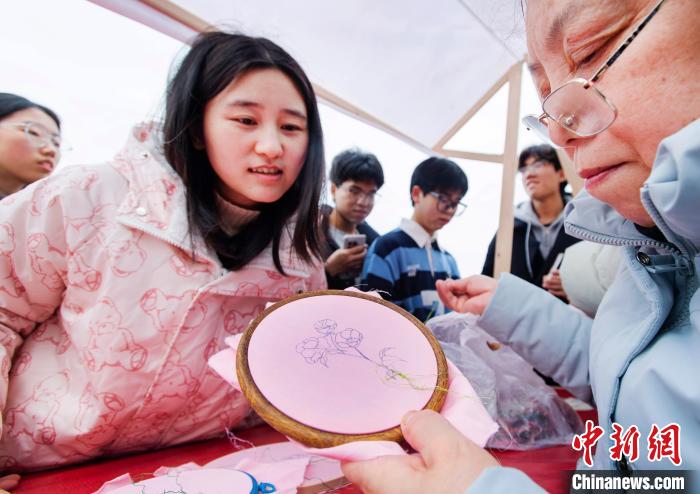 图为大学生体验三峡刺绣。冉孟军 摄