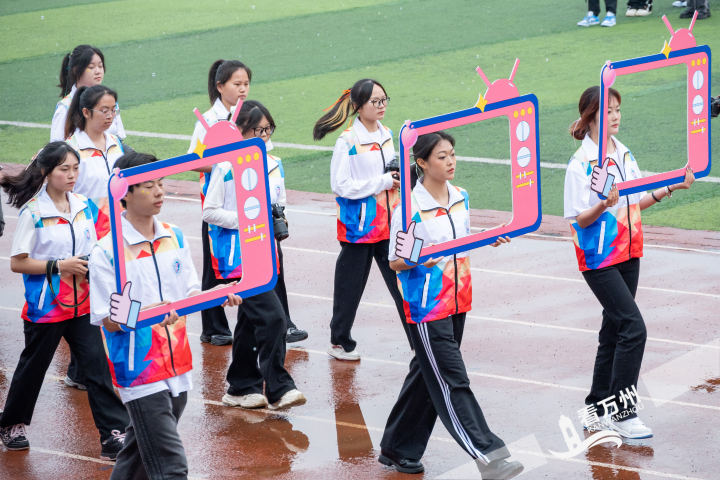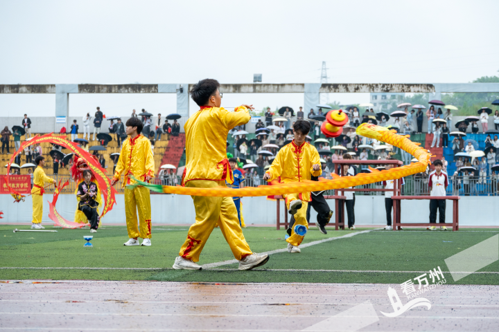 开幕式文艺汇演以“健康、阳光、青春、奋进”为主线,呈现四大篇章的视听盛宴。《中国龙》节目中,武术学子舞动长龙、抖转空竹,刚柔并济的招式勾勒千年文明脉络;《舞狮》表演中金黄狮头翻腾跃动,锣鼓声震如三峡激流,再现“风雨铁骑闯雄关”的恢宏气象;112名学子演绎的非遗竹竿舞轻盈跃动,竹节开合间踏响“同心共筑中国梦”的铿锵节拍;《霍元甲》舞者执长枪飒然起舞,以铁骨铮铮诠释巴山儿女的坚韧豪情;街舞《重庆 要的》以潮流动感点燃全场活力,百人扇舞《爱在万州》折扇如浪,刚柔相济间绘就平湖碧波千顷;《花式篮球》将指尖炫技与街舞融合,拼出象征团结的“民族同心圆”;千名师生联袂呈现的《太极拳比赛》行云流水,展绿色校园和谐之美。尾声处,全场齐唱《我和我的祖国》,近万名师生挥动红旗,赤色星海与铿锵歌声交织,将气氛推向高潮。
