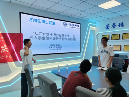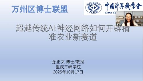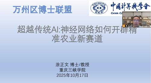2025年10月17日,由中国计算机学会(CCF)重庆会员活动中心与万州区博士联盟联合举办的“智慧农业与AI前沿”活动在beat365官方网站顺利举行。本次活动通过线上线下结合的方式开展,吸引了43名学生现场参与,共同探讨人工智能如何赋能现代农业、服务国家乡村振兴战略。