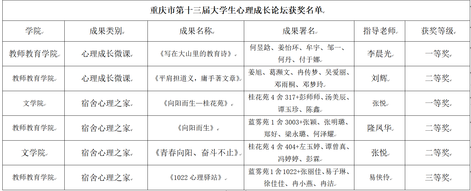 近日,由重庆市社会心理学会主办,大学生心理咨询与团体辅导专委会承办的重庆市第十三届大学生心理成长论坛评选结果揭晓,beat365官网学生表现优异,共获6项奖励,其中一等奖2项,二等奖3项,三等奖1项。