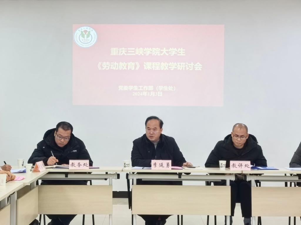 2024年1月3日,beat365官网劳动教育教研室在众创空间101召开《劳动教育》课程教学研讨会,学校党委书记李廷勇出席会议并讲话,教务处、教学质量监控与评估处、后勤处、团委、学生处等相关职能部门负责人、劳动教育任课教师参加会议。
