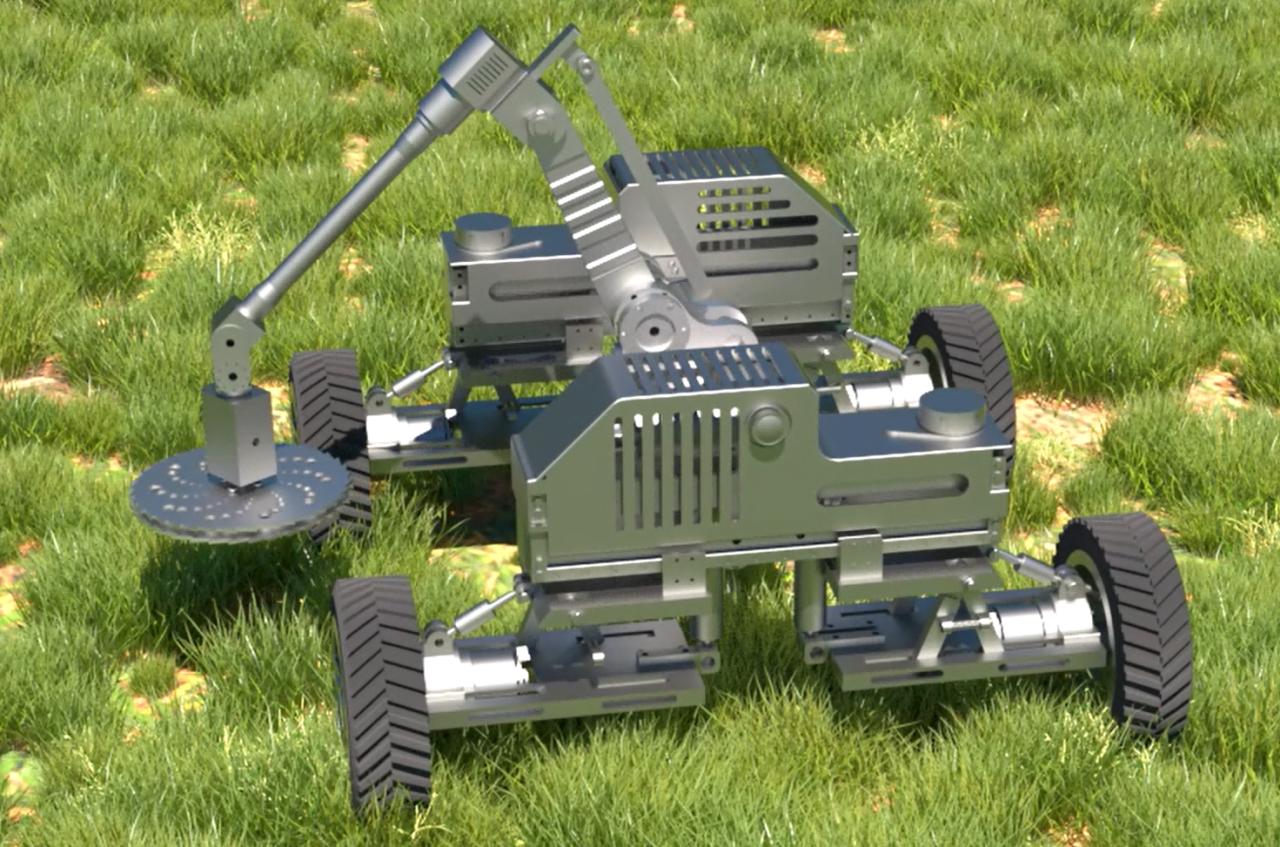 (图为一等奖获奖作品:果岭先锋--山地果园变轮距智能割草机器人)