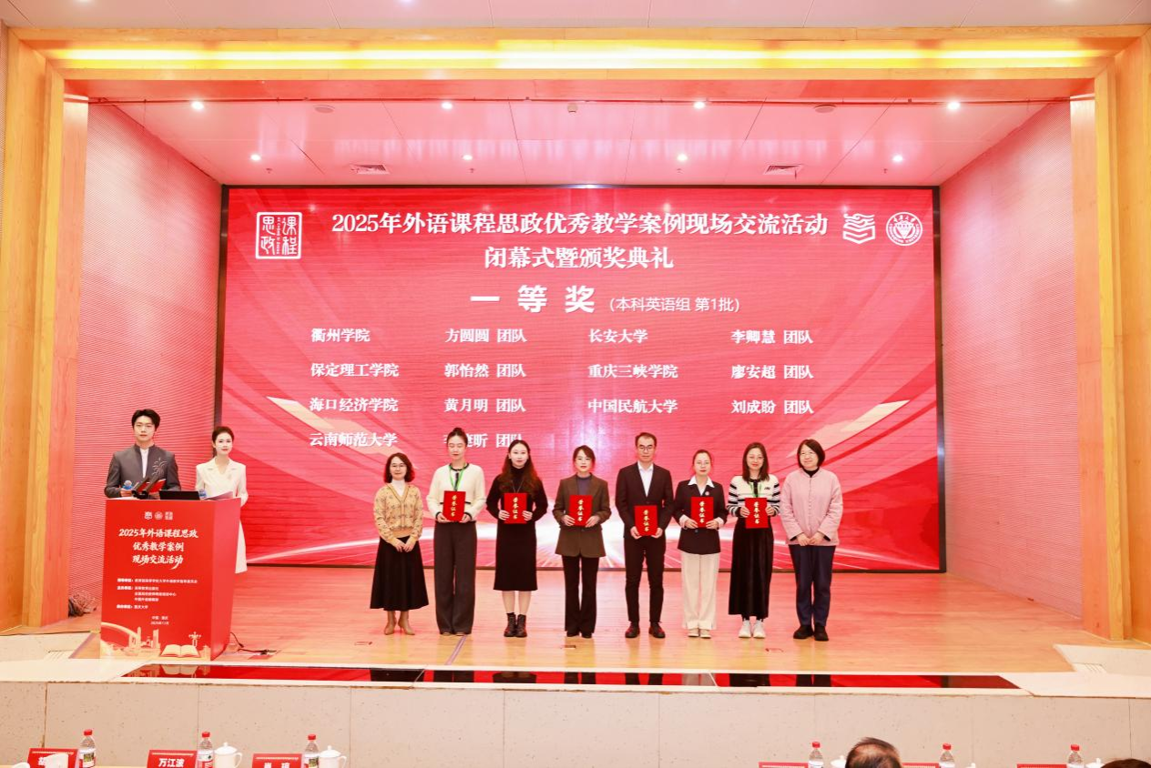 11月22日至23日,“2025年外语课程思政优秀教学案例现场交流活动”在重庆大学落幕。该活动由教育部高等学校大学外语教学指导委员会指导,高等教育出版社等单位主办。外国语学院大学英语教学部廖安超团队(成员:陈雯、程旭)喜获本科英语组国赛一等奖。