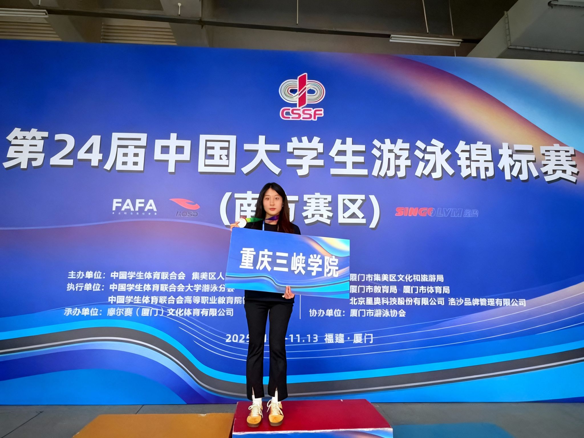 近日,在厦门奥体中心白海豚游泳馆举行的第24届中国大学生游泳锦标赛(南方赛区)中,首次组队参赛的校游泳队实现历史性突破。运动员冷明蔚在激烈竞争中发挥出色,斩获一枚宝贵的银牌,成功赢得参加全国总决赛的资格,实现了学校在游泳赛事中的历史性突破。