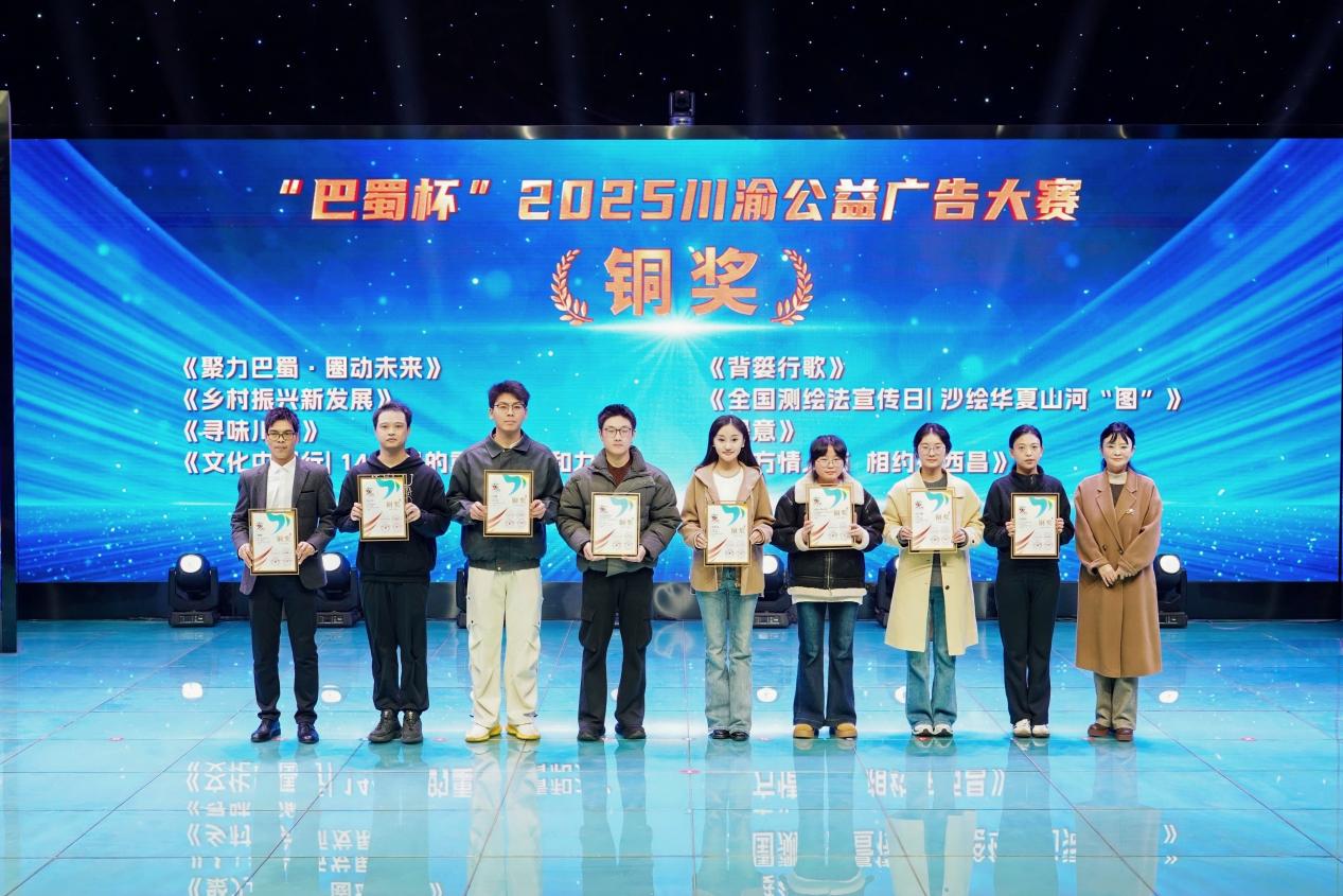 11月28日,“巴蜀杯”2025川渝公益广告大赛颁奖仪式在重庆市永川区融媒体中心圆满落幕。传媒学院2022级广告学专业肖潇同学所设计的平面作品《寻味川渝》荣获铜奖,张春蕾老师荣获指导教师奖。