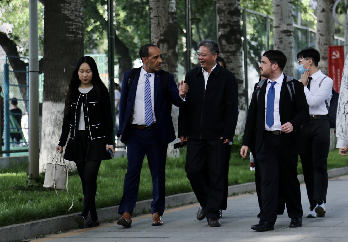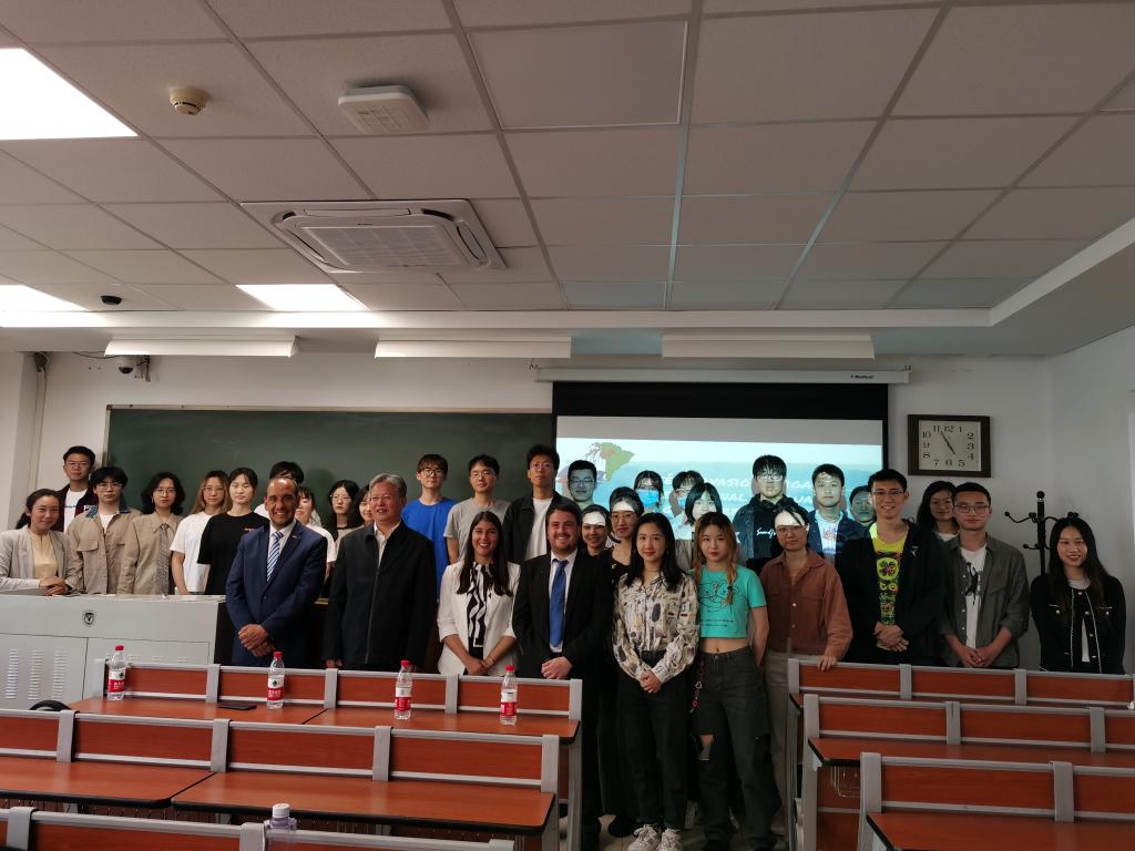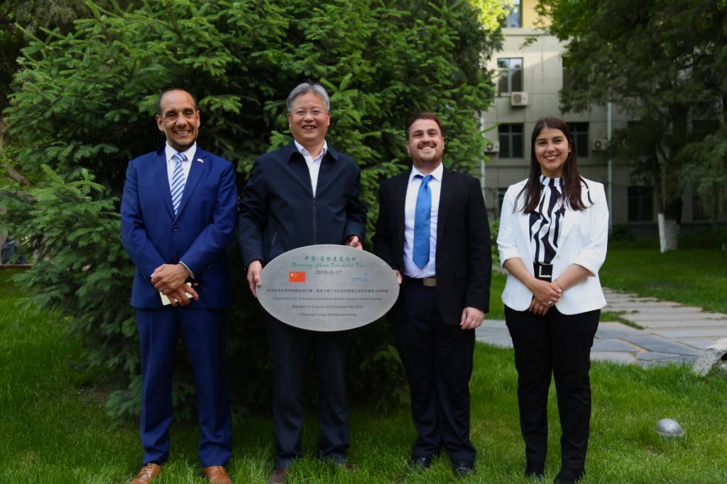讲座结束后,在pp电子游戏平台官网院长常福良的陪同下,乌拉圭驻华使馆领事塞尔西奥·德亚巴列、潘慧敏老师、张哲海老师一起参观了北外校园的“中国—乌拉圭友谊树”。